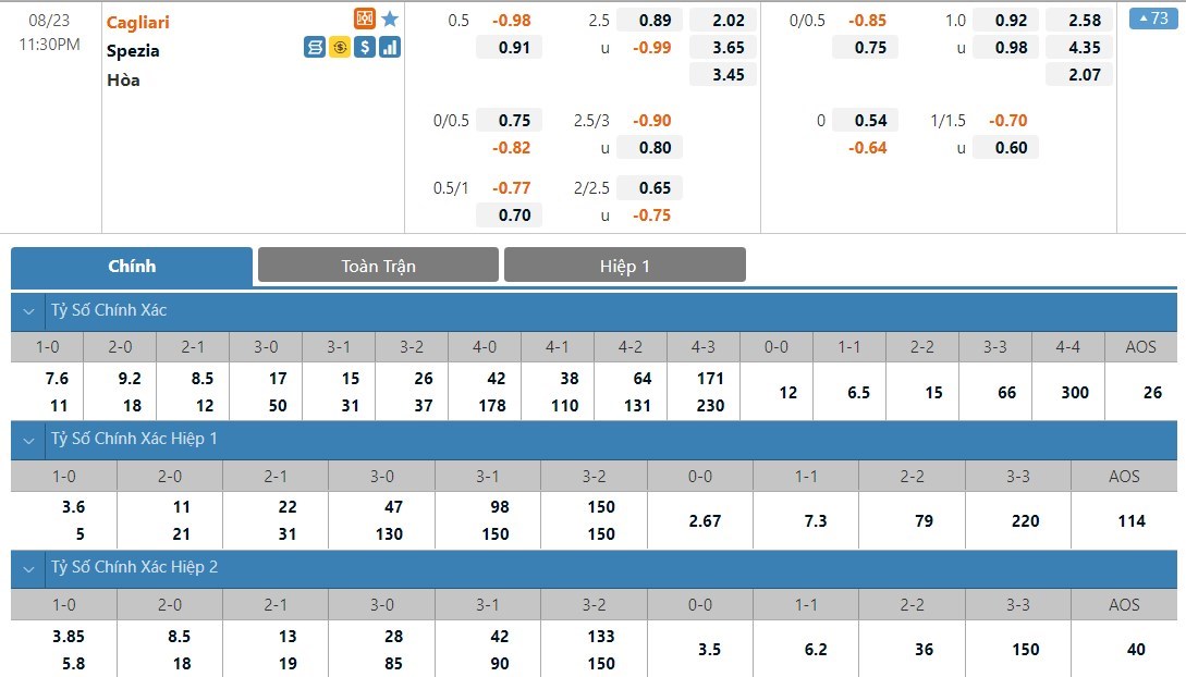 Spezia đang có phong độ tốt. Ở trận đấu gần nhất của mình thuộc khuôn khổ Siêu Cúp Italia, Spezia đã giành chiến thắng 3-1 trước Pordenone. Đó cũng là trận thứ 4 liên tiếp Spezia bất bại và trong 4 trận đó, cửa cược Spezia thắng kèo tới 3 lần. Với phong độ như hiện tại, Spezia đang là một lựa chọn có thể tin tưởng đặc biệt là khi họ ở thế cửa dưới. Trong khi đó Cagliari đang tiếp tục không được đánh giá quá cao và họ đang có phong độ thiếu ổn định. Trong 4 trận gần đây, Cagliari thắng 2 và thua 2 trận. So với Spezia, Cagliari đang tỏ ra không quá vượt trội và họ sẽ khó thắng ở trận này. Ở mùa giải trước, Cagliari cũng không thắng được Spezia lần nào ở cả 2 lần 2 đội gặp nhau. Với tỷ lệ chấp 1/2 trái, cửa dưới Spezia sẽ là lựa chọn cho kèo đấu này.