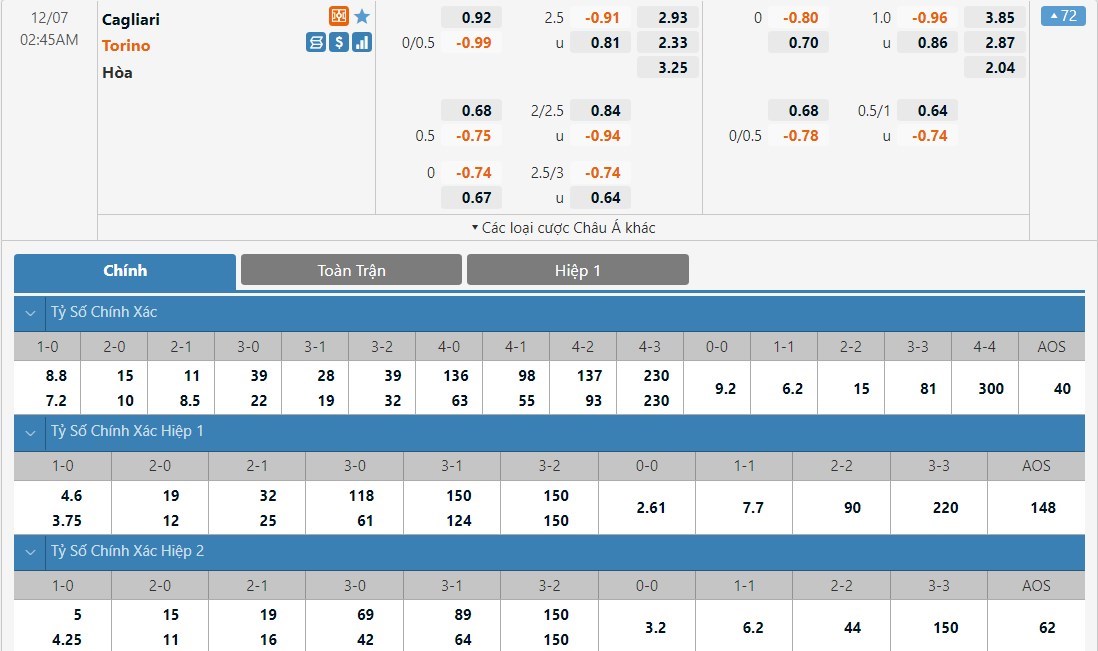 Soi kèo châu Á Cagliari vs Torino