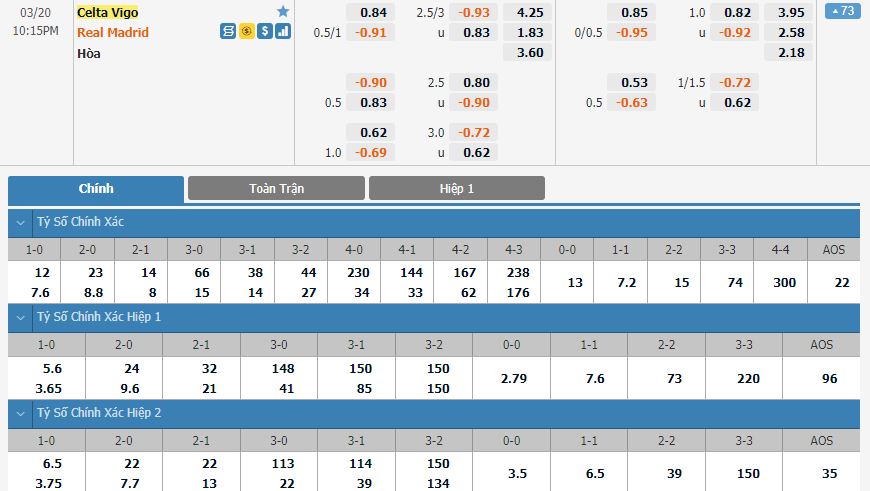 Dự đoán kèo tỷ số hiệp 1: Celta Vigo 0-2 Real Madrid