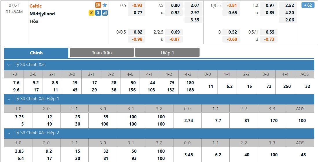 Midtjylland đang có phong độ không tốt. Ở vòng đấu đầu tiên của mùa giải VĐQG Đan Mạch năm nay, Midtjylland vừa bất ngờ phải nhận thất bại trước Odense với tỷ số 1-2 ngay trên sân nhà. Như vậy trong 3 trận gần nhất của mình, Midtjylland để thua tới 2 trận. Có phong độ không tốt và còn phải làm khách trước một Celtic rất khó chịu, Midtjylland sẽ có một trận đấu rất khó khăn. Celtic là một đội bóng có thực lực không hề yếu tại châu Âu hiện này và với những gì đang có, Celtic sẽ hoàn toàn có thể lấn lướt được Midtjylland khi được thi đấu trên sân nhà. Với tỷ lệ chấp 1/2 trái, cửa trên Celtic sẽ là lựa chọn được đánh giá cao hơn ở kèo đấu này.