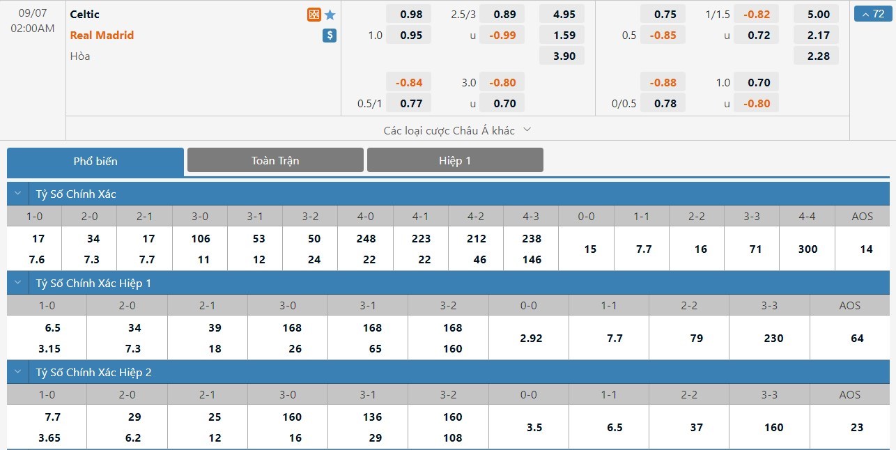 Phải làm khách nhưng Real Madrid vẫn sẽ được đánh giá rất cao ở trận này. Kết quả Real Madrid thắng trận chỉ có tỷ lệ cược là 1 ăn 1.59 trong khi đó kết quả Celtic thắng trận có tỷ lệ cược là 1 ăn 4.95. Tỷ số hòa có tỷ lệ cược là 1 ăn 3.90. Celtic đang có phong độ rất cao. Với lợi thế sân nhà, họ có thể sẽ tạo ra được bất ngờ và ô cược hòa sẽ là một lựa chọn không tệ cho kèo đấu này.