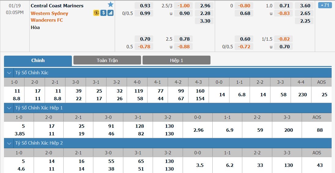 Dự đoán kèo tỷ số hiệp 1: Central Coast Mariners 2-0 Western Sydney Wanderers