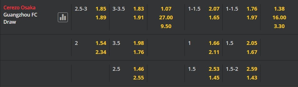 Tỷ lệ cược của Cerezo Osaka và Guangzho ở kèo đấu này vẫn sẽ có sự chênh lệch cực kì lớn khi mà Cerezo Osaka vẫn được đánh giá cao hơn Guangzhou rất nhiều. Mục tiêu của 2 đội đang là khác nhau và Guangzhou với đội hình trẻ cũng sẽ rất khó để nghĩ tới việc tránh được thất bại. Với kèo đấu này, cửa trên Cerezo Osaka vẫn sẽ là lựa chọn hợp lý.
