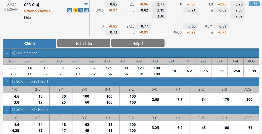 Dự đoán kèo tỷ số hiệp 1: CFR Cluj 2-0 Crvena Zvezda