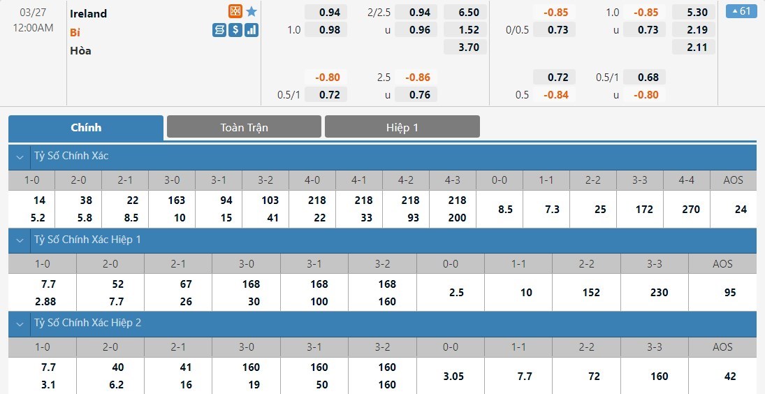 Kèo châu Á toàn trận: CH Ireland +1 (FT)