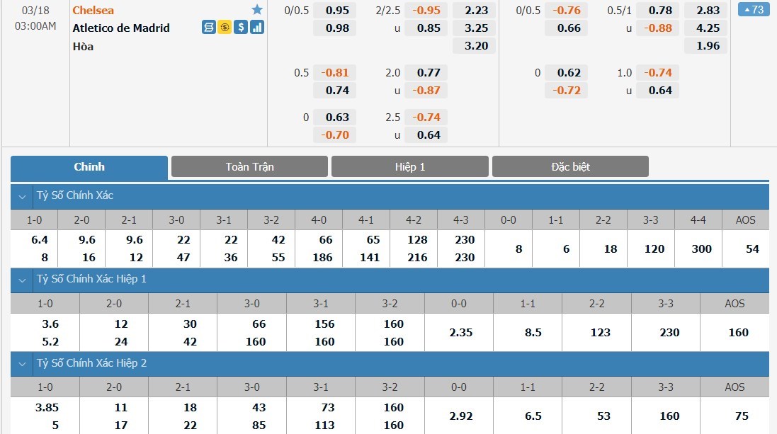 Ở kèo đấu này, Chelsea được đánh giá cao hơn đôi chút so với Atletico Madrid. Đội chủ nhà có tỷ lệ cược là 1 ăn 2.23 trong khi đó đội khách có tỷ lệ cược là 1 ăn 3.25. Tỷ số hòa có tỷ lệ cược là 1 ăn 3.20. Với việc không cái tên nào trong số 2 đội tỏ ra quá vượt trội, ô cược hòa sẽ là một lựa chọn đáng cân nhắc.