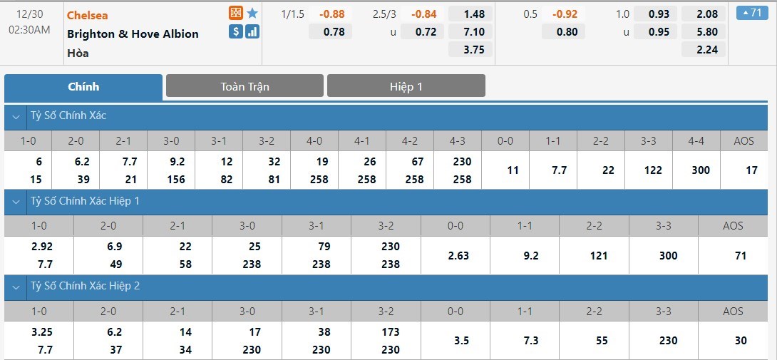 Chelsea vẫn sẽ được đánh giá cao hơn Brighton khá nhiều ở kèo đấu này. Tỷ lệ cược của Chelsea chỉ là 1 ăn 1.48 trong khi đó Brighton có tỷ lệ cược lên tới 1 ăn 7.10. Tỷ số hòa có tỷ lệ cược là 1 ăn 3.75. Brighton lúc này đang có phong độ không tốt. Làm khách trước một Chelsea rất mạnh, họ sẽ khó tránh được một thất bại và cửa trên Chelsea vẫn sẽ là lựa chọn cho kèo đấu này.