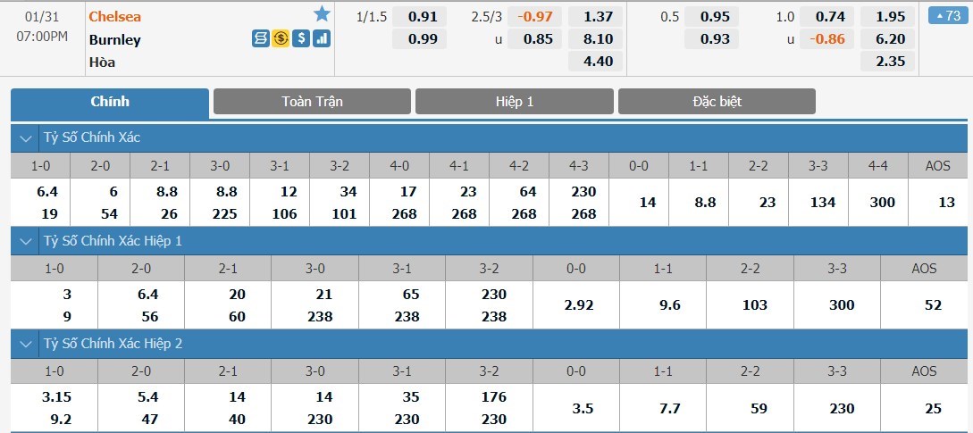 Chelsea vẫn được đánh giá cao hơn Burnley rất nhiều ở kèo đấu này. Tỷ lệ cược của Chelsea chỉ là 1 ăn 1.37 trong khi đó Burnley có tỷ lệ cược lên tới 1 ăn 8.10. Tỷ số hòa có tỷ lệ cược là 1 ăn 4.40. Burnley mùa này thi đấu không mấy ấn tượng và trước một đối thủ vừa sức, Chelsea được dự đoán vẫn sẽ có 3 điểm ở trận này.