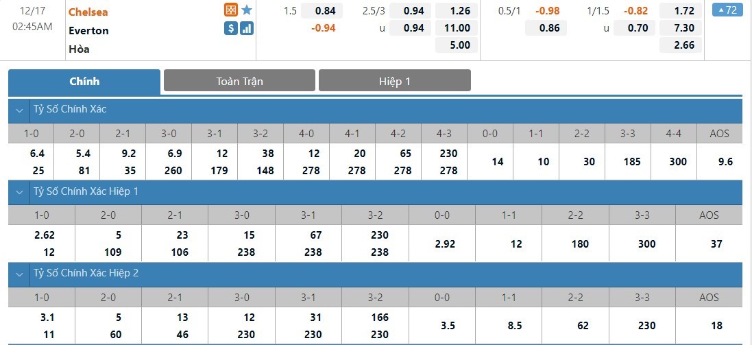Chelsea sẽ được đánh giá cao hơn Everton rất nhiều ở kèo đấu này. Tỷ lệ cược của Chelsea là 1 ăn 1.26 trong khi đó Everton có tỷ lệ cược là 1 ăn 11.00. Tỷ số hòa có tỷ lệ cược là 1 ăn 5.00. Chelsea lúc này đang nhỉnh hơn Everton không ít và được chơi trên sân nhà, họ sẽ không bỏ quá cơ hội giành được chiến thắng ở trận này.