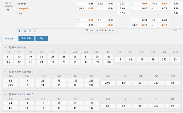 Soi kèo tài xỉu, kèo tỷ số Chelsea vs Liverpool
