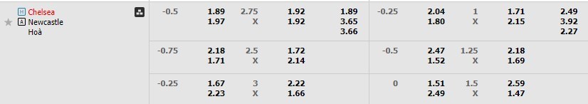 Trong 5 trận đấu gần nhất trên mọi đấu trường, Chelsea đã mang về cho mình 9 pha lập công cùng với 14 lần phải vào lưới nhặt bóng. Bên kia chiến tuyến, Newcastle đã sở hữu 4 bàn thắng, còn lại là việc hàng thủ đã phải nhận 10 bàn thua. Các nhà đầu tư nên tin tưởng vào khả năng nổ Tài ở cuộc đối đầu này với tỷ lệ tài xỉu là 2 3/4 trái.