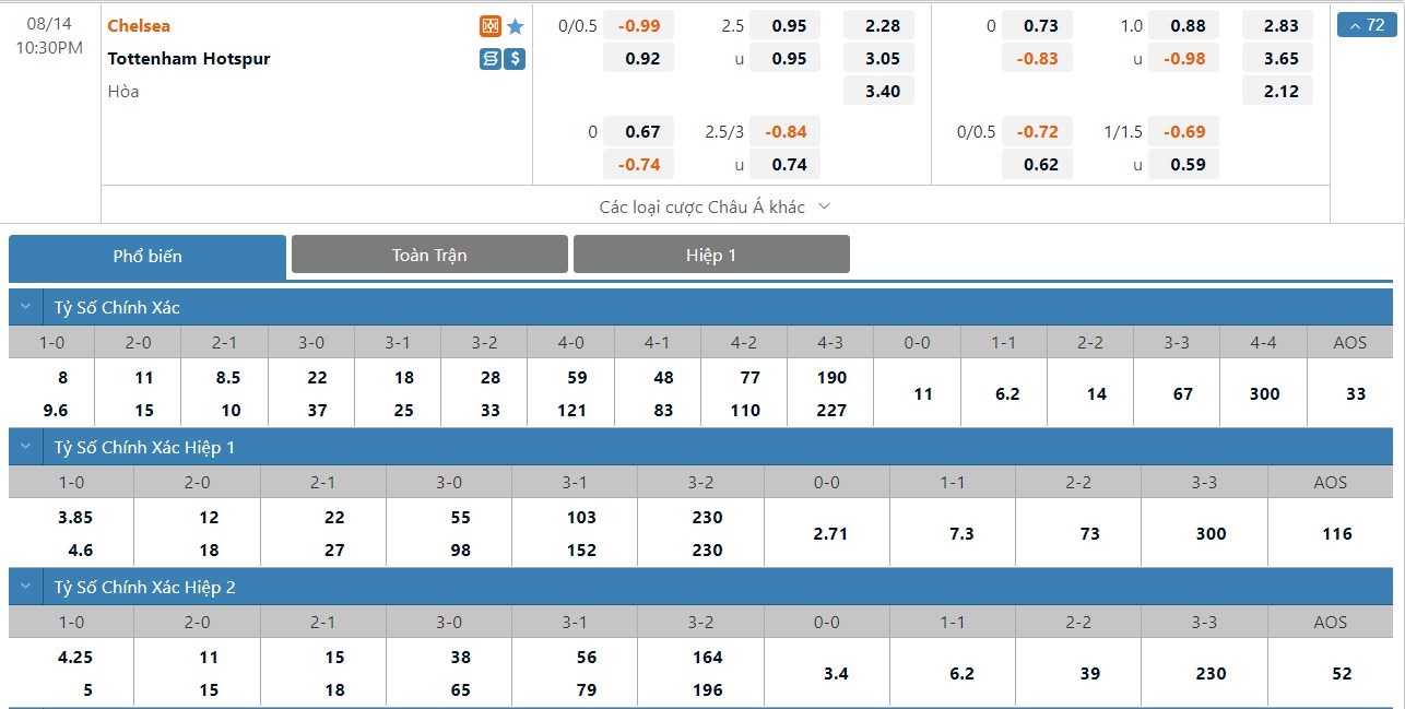 Chelsea được đánh giá cao hơn Tottenham đôi chút ở trận này. Kết quả Chelsea thắng trận có tỷ lệ cược là 1 ăn 2.28 trong khi đó kết quả Tottenham thắng trận có tỷ lệ cược là 1 ăn 3.05. Tỷ số hòa có tỷ lệ cược là 1 ăn 3.40. Chelsea đang có phong độ không quá thuyết phục và lúc này họ cũng không quá vượt trội so với Tottenham. Ở kèo đấu này, ô cược hòa sẽ là lựa chọn được đánh giá cao.
