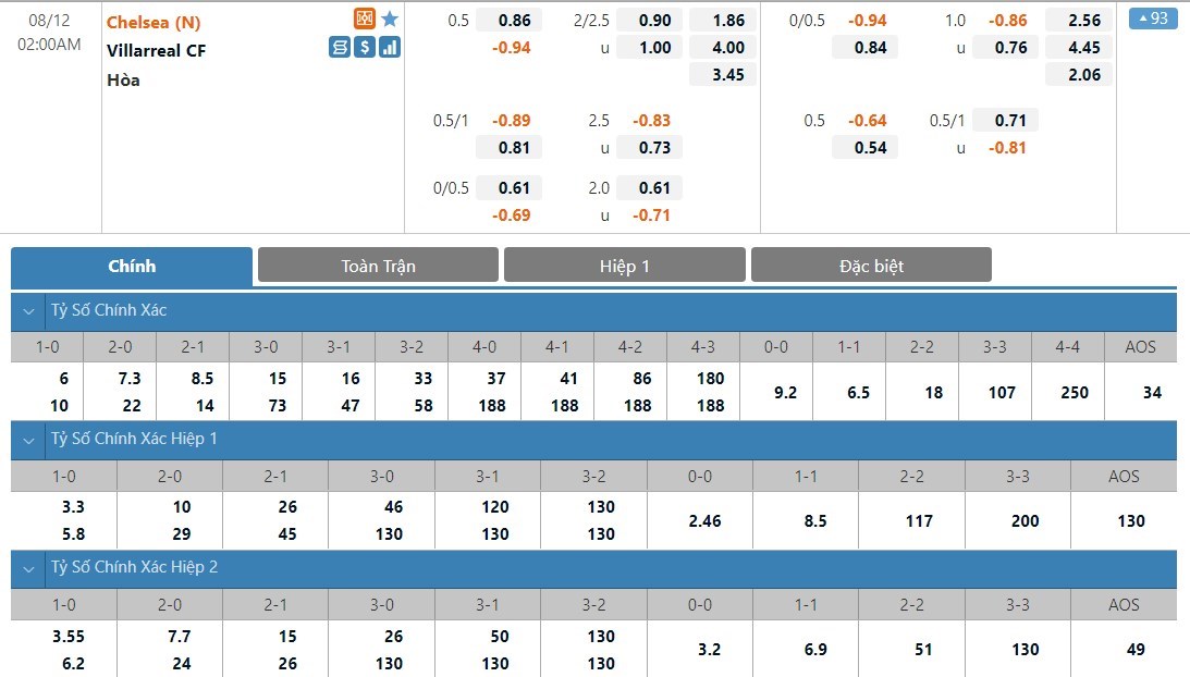Chelsea sẽ được đánh giá cao hơn Villarreal khá nhiều ở kèo đấu này. Tỷ lệ cược của Chelsea là 1 ăn 1.86 trong khi đó Villarreal có tỷ lệ cược lên tới 1 ăn 4.00. Tỷ số hòa có tỷ lệ cược là 1 ăn 3.45. Villarreal lúc này đang có phong độ không cao. Trước một đối thủ trên cơ, đội bóng Tây Ban Nha được dự đoán sẽ khó tạo ra được bất ngờ.