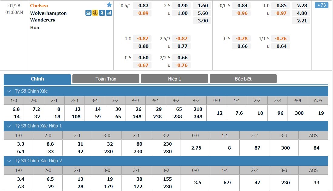 Với lợi thế sân nhà, Chelsea được đánh giá cao hơn Wolverhampton khá nhiều ở kèo đấu này. Đội chủ nhà chỉ có tỷ lệ cược là 1 ăn 1.60 trong khi đội khách có tỷ lệ cược lên tới 1 ăn 5.60. Tỷ số hòa có tỷ lệ cược là 1 ăn 3.90. Chelsea vẫn đang thể hiện một lối chơi rất thiếu thuyết phục và Wolverhampton hoàn toàn có thể nghĩ tới việc có 1 điểm ở trận này. Đây là kèo đấu mà ô cược hòa sẽ là lựa chọn được đánh giá cao.