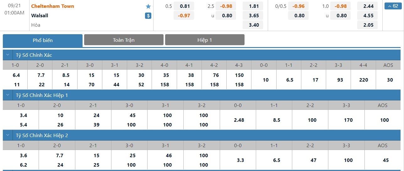 Soi kèo Cheltenham Town vs Walsall, 1h00, 21/9/2022
