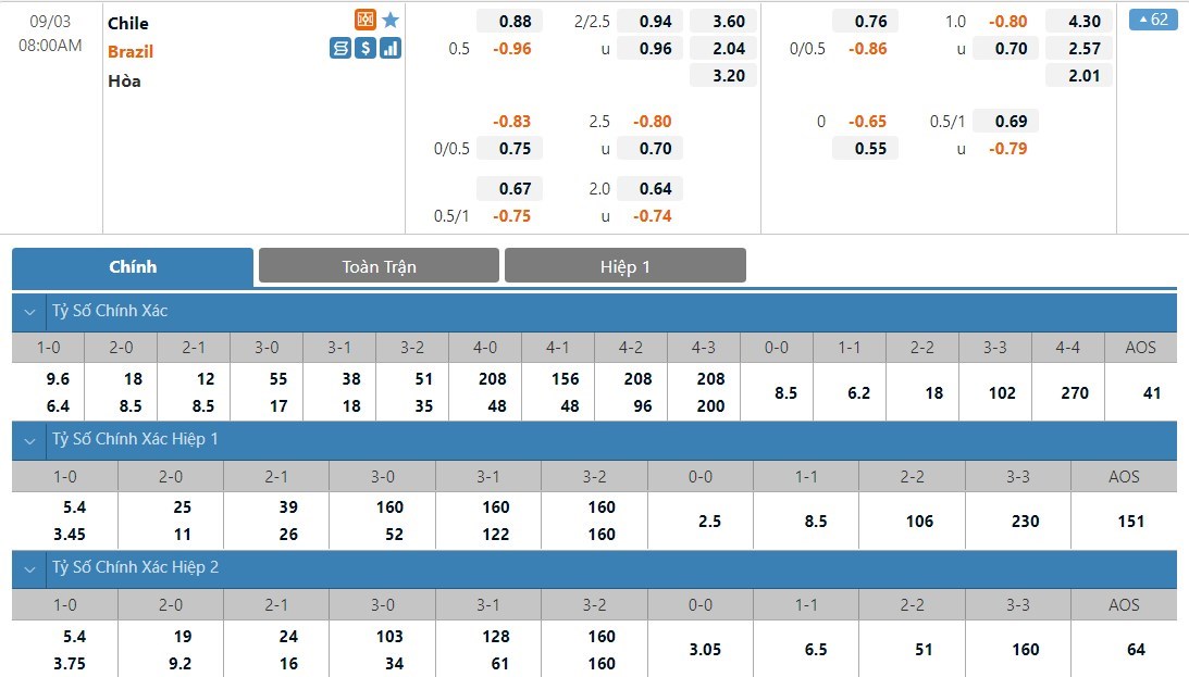 Brazil được đánh giá là cửa trên ở trận này với tỷ lệ cược 1 ăn 2.04. Chile có tỷ lệ cược là 1 ăn 3.60 trong khi đó tỷ số hòa có tỷ lệ cược là 1 ăn 3.20. Chile lúc này đang không được đánh giá quá cao trong khi đó Brazil vẫn đang tỏ ra khá ổn định. Ở kèo đấu này, Brazil được dự đoán vẫn sẽ có một chiến thắng.