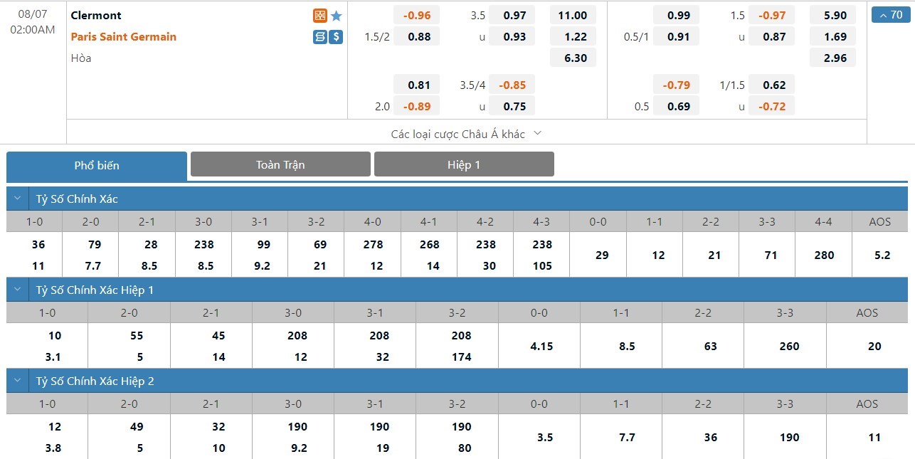 PSG được dự đoán sẽ có một trận đấu không quá dễ dàng. Clermont là đội bóng có lối chơi phòng ngự khá khó chịu. Với lợi thế sân nhà, họ có thể sẽ chơi chắc chắn để khiến cho PSG phải rất vất vả mới có được chiến thắng. Phong độ của Clermont cũng đang là khá ấn tượng. Ở liên tiếp 3 trận gần nhất của mình, Clermont đều giành được chiến thắng và họ bước vào mùa giải mới với tâm lý hết sức tự tin. Phong độ sân khách của PSG cũng đang là không quá ổn định và họ sẽ khó thắng đậm ở trận này. Với tỷ lệ chấp sâu lên tới 1 3/4 trái, cửa dưới Clermont sẽ là lựa chọn được đánh giá cao hơn.