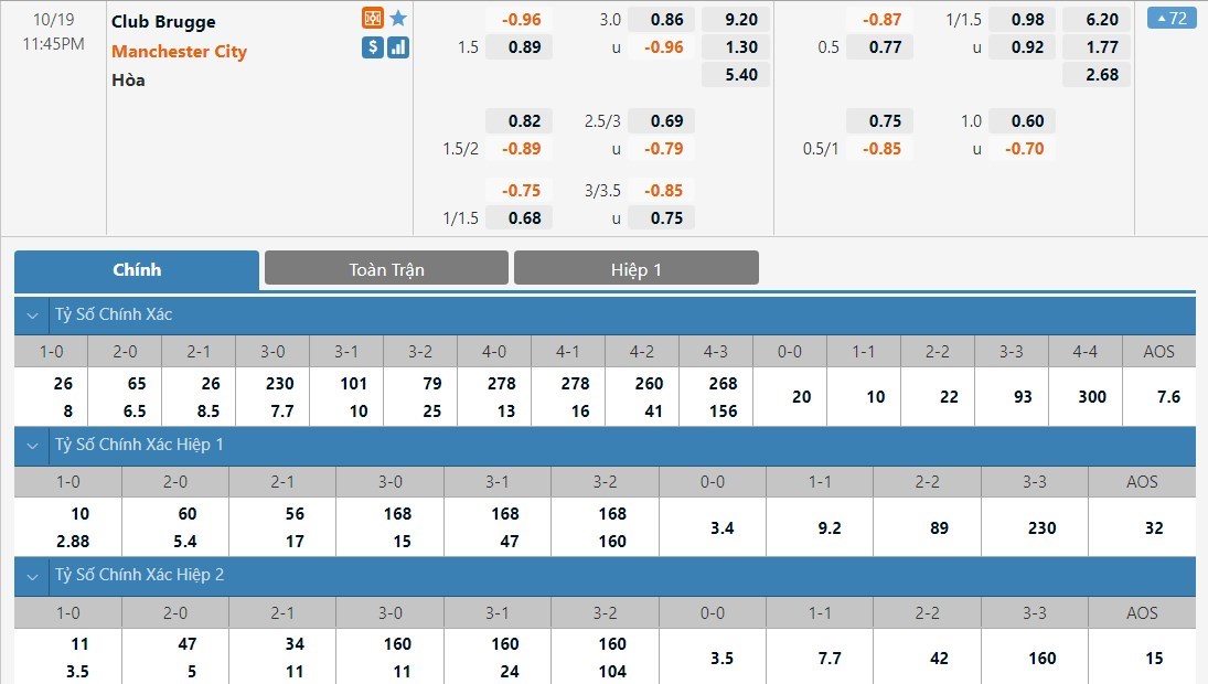 Man City vẫn sẽ được đánh giá cao hơn Club Brugge khá nhiều ở kèo đấu này. Tỷ lệ cược của Man City chỉ là 1 ăn 1.30 trong khi đó Club Brugge có tỷ lệ cược lên tới 1 ăn 9.20. Tỷ số hòa có tỷ lệ cược là 1 ăn 5.40. Man City lúc này được đánh giá vẫn có trình độ nhỉnh hơn Club Brugge khá nhiều và họ vẫn sẽ có được chiến thắng ở trận này.