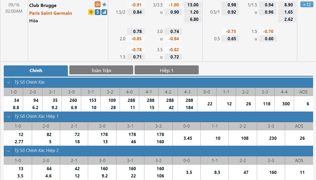 Dự đoán kèo tỷ số hiệp 1: Club Brugge 0-2 Paris Saint Germain