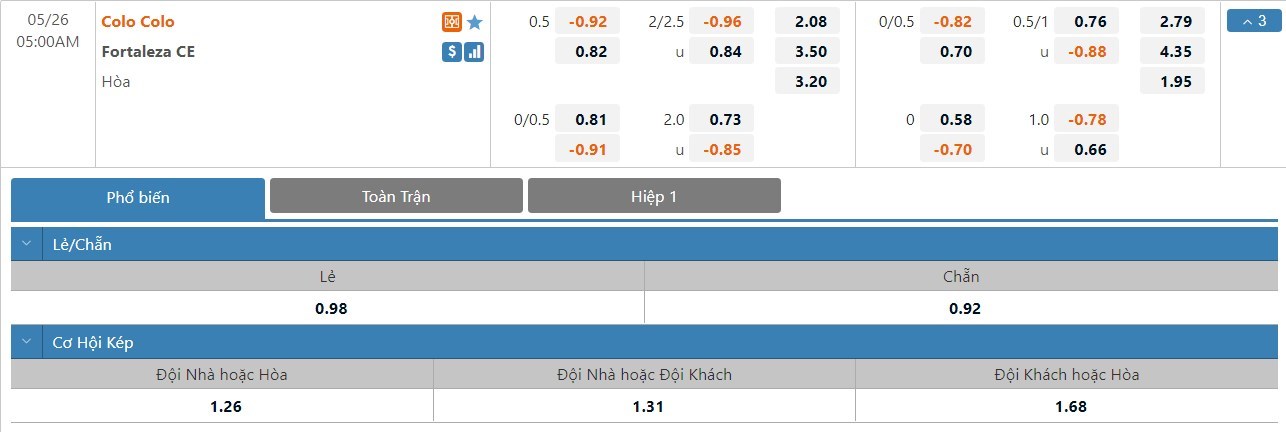 Colo Colo với lợi thế sân nhà sẽ là cửa trên ở trận này. Kết quả Colo Colo thắng trận chỉ có tỷ lệ cược là 1 ăn 2.08 trong khi đó kết quả Fortaleza thắng trận có tỷ lệ cược là 1 ăn 3.50. Tỷ số hòa có tỷ lệ cược là 1 ăn 3.20. Colo Colo đang có phong độ không quá ấn tượng. So với Fortaleza, họ cũng đang có trình độ không quá vượt trội và họ sẽ khó để có được một chiến thắng ở trận này. Nhiều khả năng hai đội sẽ phải chia điểm với nhau.