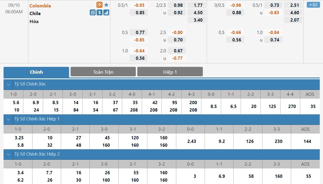 Soi kèo tài xỉu, kèo tỷ số Colombia vs Chile