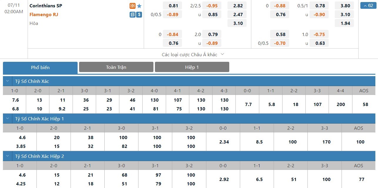 Trong 4 trận gần nhất của mình, Flamengo ghi được tới 13 bàn thắng. Đội khách đang có phong độ rất cao và họ đang có khả năng ghi được nhiều bàn thắng. Corinthians trên sân nhà cũng là đội tấn công không tệ. Trận đấu này được dự đoán sẽ diễn ra hấp dẫn và bàn thắng sẽ xuất hiện không ít. Ô cược tài sẽ là lựa chọn cho kèo đấu này.