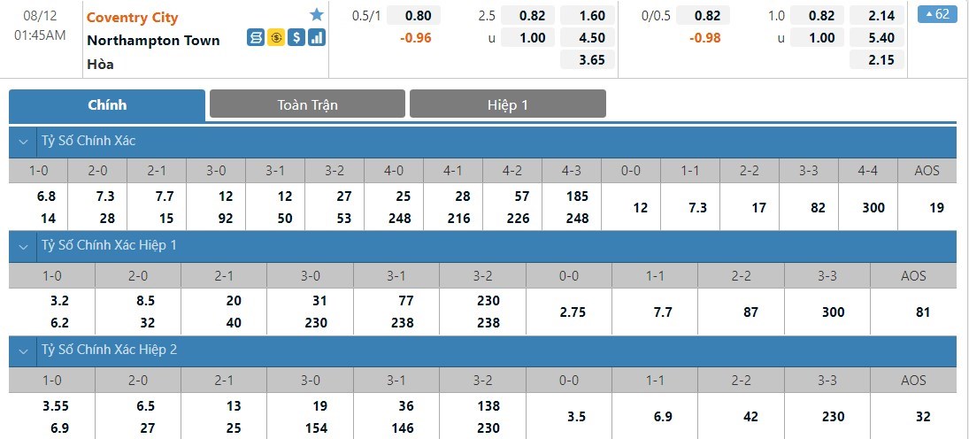 Coventry chắc chắn sẽ được đánh giá cao hơn Northampton rất nhiều ở kèo đấu này. Tỷ lệ cược của Coventry là 1 ăn 1.60 trong khi đó Northampton có tỷ lệ cược lên tới 1 ăn 4.50. Tỷ số hòa có tỷ lệ cược là 1 ăn 3.65. Northampton đang có phong độ tốt trong khi đó Coventry đang tỏ ra không quá ổn định. Mạo hiểm với kết quả hòa ở trận này sẽ là một lựa chọn không quá tệ.