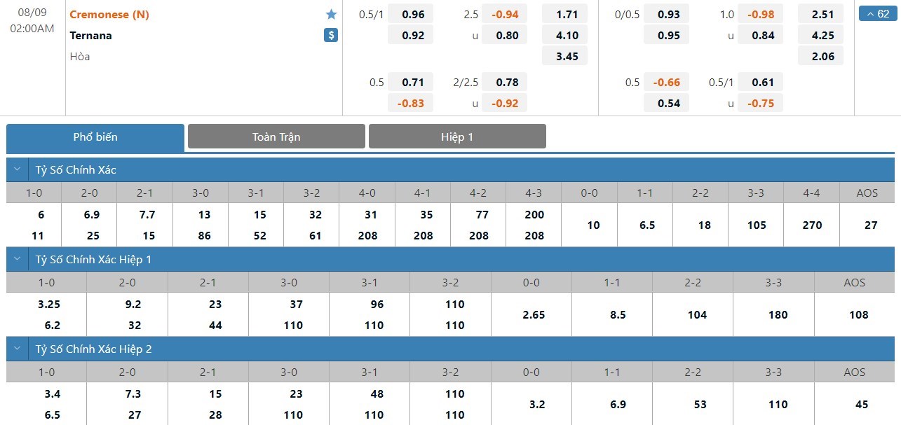 Cremonese có quyền tự tin ở trận này khi mà họ sẽ chỉ phải đón tiếp một đối thủ hạng dưới. Giành quyền lên hạng ở mùa giải năm nay, Cremonese cũng đã có những sự đầu tư và lúc này so với những đối thủ hạng 2 như Ternana, họ đang tỏ ra nhỉnh hơn. Phong độ của Cremonese cũng đang là khá tốt đặc biệt là ở những trận sân nhà. Ở cả 3 trận sân nhà gần nhất của mình, Cremonese đều có được những chiến thắng. Ở mùa giải năm ngoái, Cremonese cũng đã vượt qua Ternana ở cả 2 lần 2 đội gặp nhau và đây không phải đối thủ mà họ phải quá e ngại. Với tỷ lệ chấp ở mức 3/4 trái, cửa trên Cremonese là lựa chọn có thể tin tưởng ở kèo đấu này.