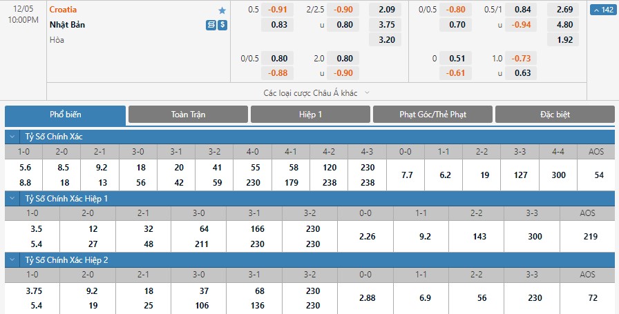 Dự đoán kèo tỷ số hiệp 1: Croatia 1-0 Nhật Bản