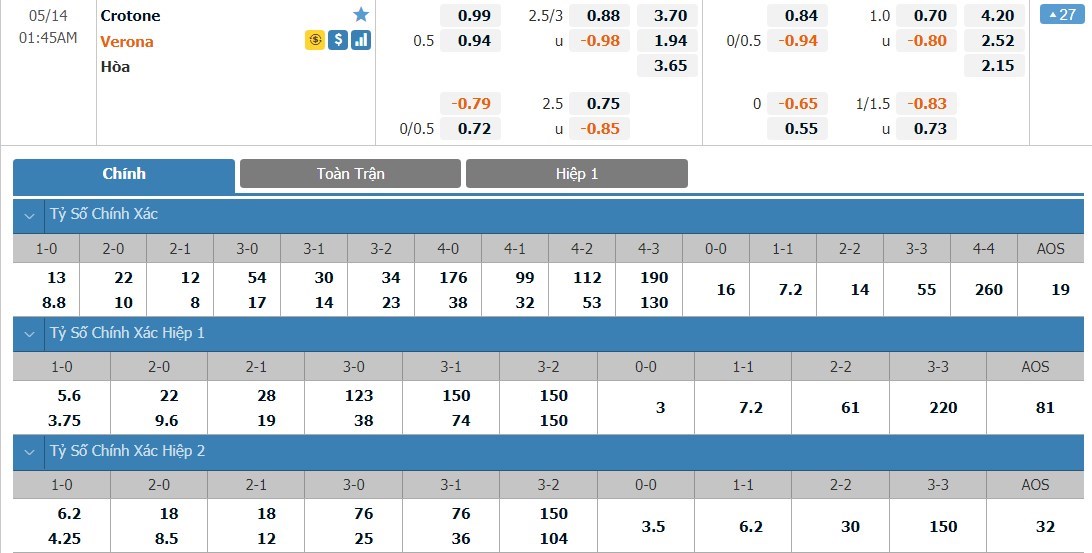 Phải làm khách nhưng Verona vẫn được đánh giá cao hơn Crotone khá nhiều ở kèo đấu này. Tỷ lệ cược của Verona chỉ là 1 ăn 1.94 trong khi đó Crotone có tỷ lệ cược là 1 ăn 3.70. Tỷ số hòa có tỷ lệ cược là 1 ăn 3.65. Crotone lúc này vẫn bị đánh giá rất thấp khi họ vẫn thi đấu tệ và cũng không còn động lực. Trước một đối thủ quá yếu, Verona sẽ đủ khả năng giành 3 điểm ở trận này.