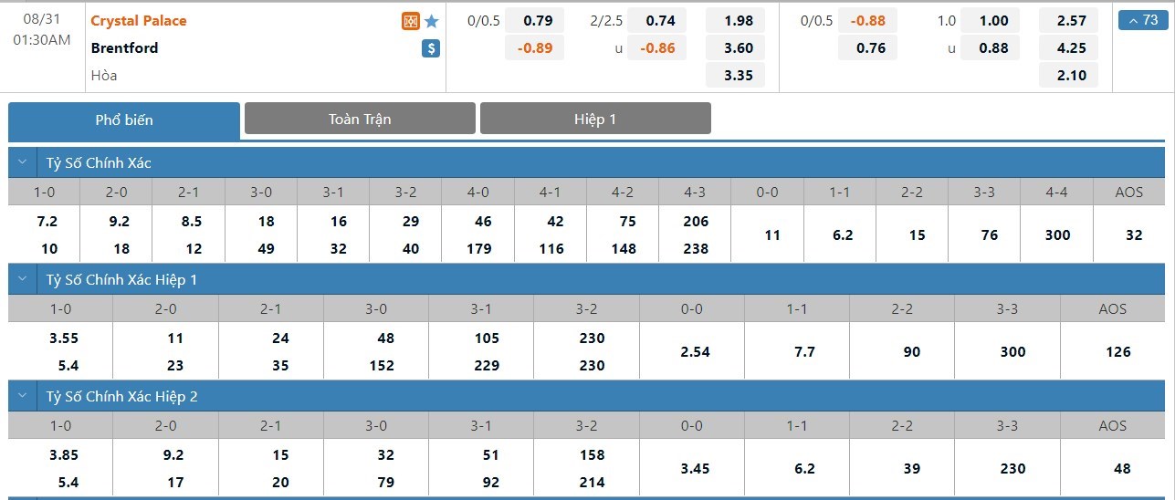 Tỷ lệ cược của Crystal Palace so với Brentford ở kèo đấu này sẽ thấp hơn đôi chút. Đội chủ nhà có tỷ lệ là 1 ăn 1.98 trong khi đó đội khách có tỷ lệ là 1 ăn 3.60. Tỷ số hòa có tỷ lệ cược là 1 ăn 3.35. Brentford đang thi đấu khá lì lợm và họ so với Crystal Palace đang không hề thua kém. Ở mùa giải năm ngoái, hai đội cũng hòa nhau ở cả 2 lần gặp nhau và ô cược hòa vẫn sẽ là lựa chọn được đánh giá cao ở kèo đấu này.