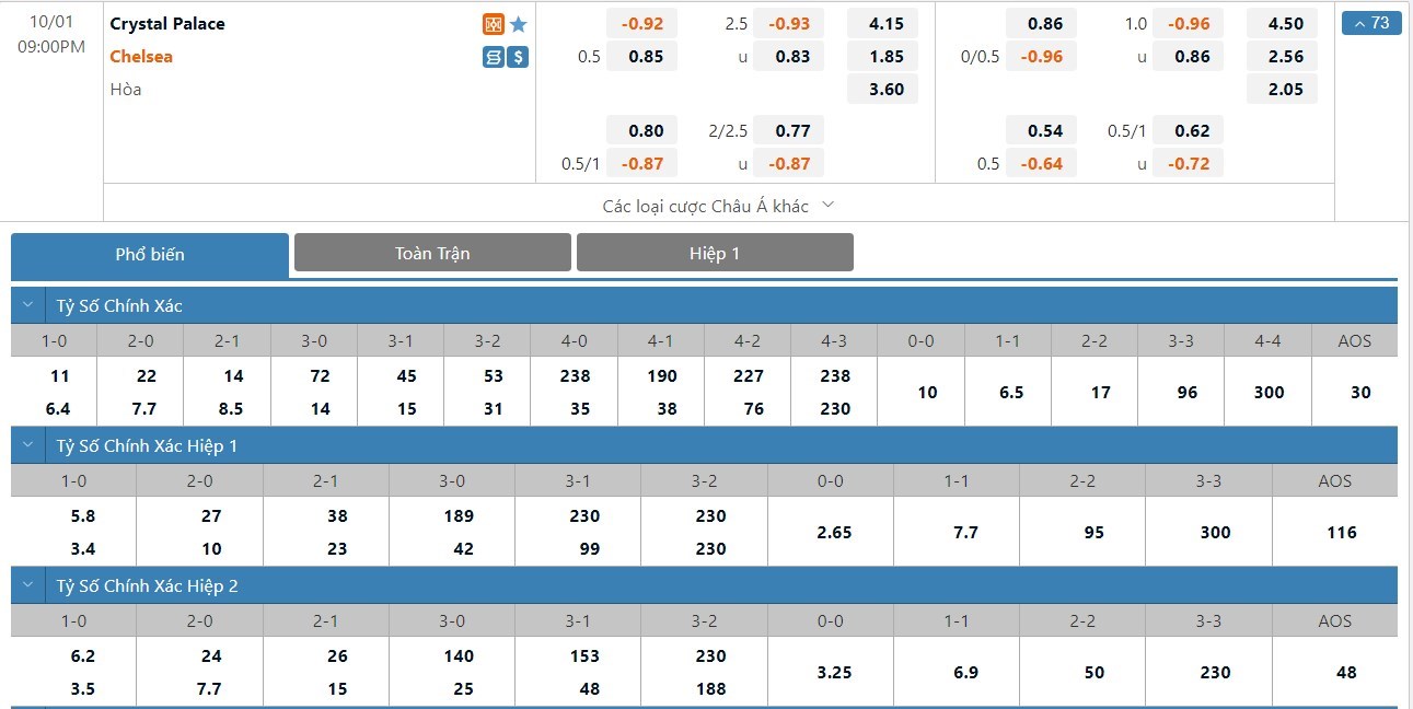 Chelsea vẫn được đánh giá cao hơn Crystal Palace khá nhiều ở trận này. Kết quả Chelsea thắng trận chỉ có tỷ lệ cược là 1 ăn 1.85. Các kết quả Crystal Palace thắng và hòa lần lượt có tỷ lệ cược lên tới 1 ăn 4.15 và 1 ăn 3.60. Chelsea đang có phong độ không tốt và đây có thể sẽ là chuyến làm khách khó khăn cho họ. Có thể mạo hiểm với ô cược hòa ở kèo đấu này.
