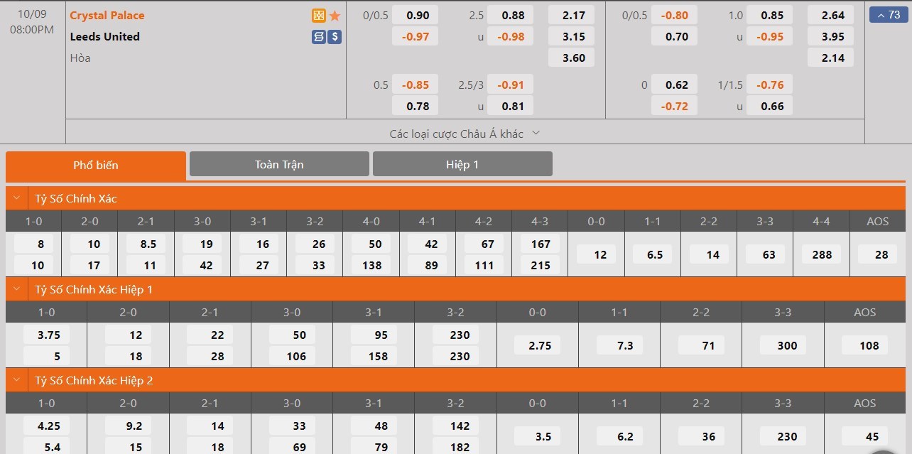 Với lợi thế sân nhà, Crystal Palace sẽ được đánh giá cao hơn đôi chút so với Leeds ở trận này. Kết quả Crystal Palace thắng trận có tỷ lệ cược là 1 ăn 2.17 trong khi đó kết quả Leeds thắng trận có tỷ lệ cược ở mức 1 ăn 3.15. Tỷ số hòa có tỷ lệ cược là 1 ăn 3.60. Crystal Palace đang có phong độ không tốt và họ sẽ khó áp đảo được Leeds. Đây là lúc mà Leeds cũng chơi không tệ và họ sẽ kiếm được 1 điểm ở trận này.