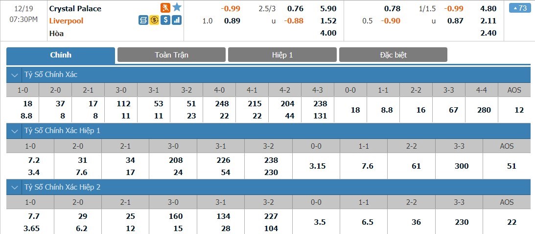 Liverpool chắc chắn vẫn sẽ được đánh giá cao hơn Crystal Palace rất nhiều ở trận này. Đội khách chỉ có tỷ lệ cược ở mức 1 ăn 1.52 trong khi đội chủ nhà có tỷ lệ cược lên tới 1 ăn 5.90. Tỷ số hòa có tỷ lệ cược 1 ăn 4.00. Liverpool đang gặp quá nhiều khó khăn với bão chấn thương và họ cũng đang có phong độ không tốt trên sân khách. Có cơ sở để người chơi có thể mạo hiểm với ô cược hòa ở kèo đấu này.