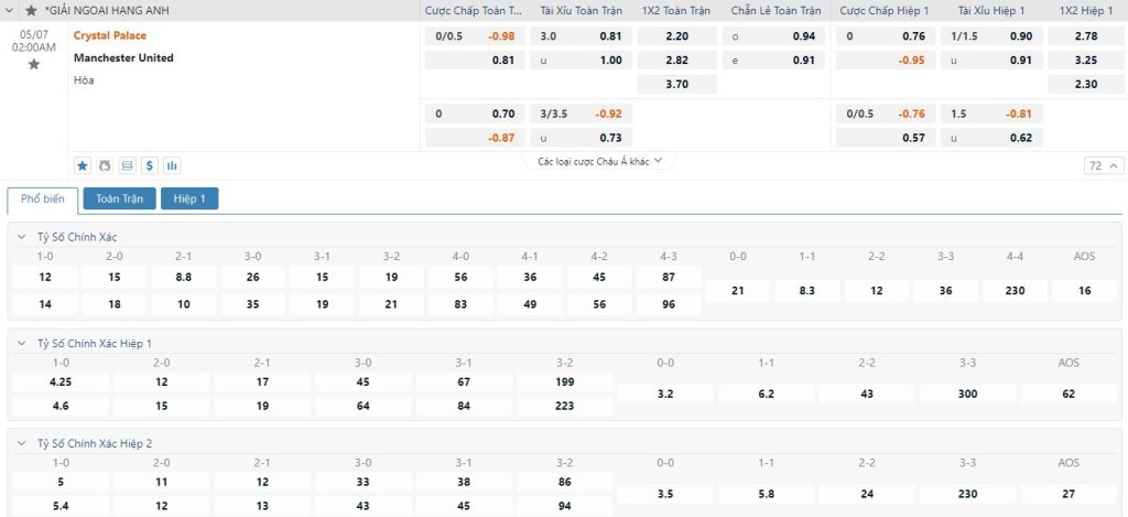 Soi kèo châu Á Crystal Palace vs Manchester United