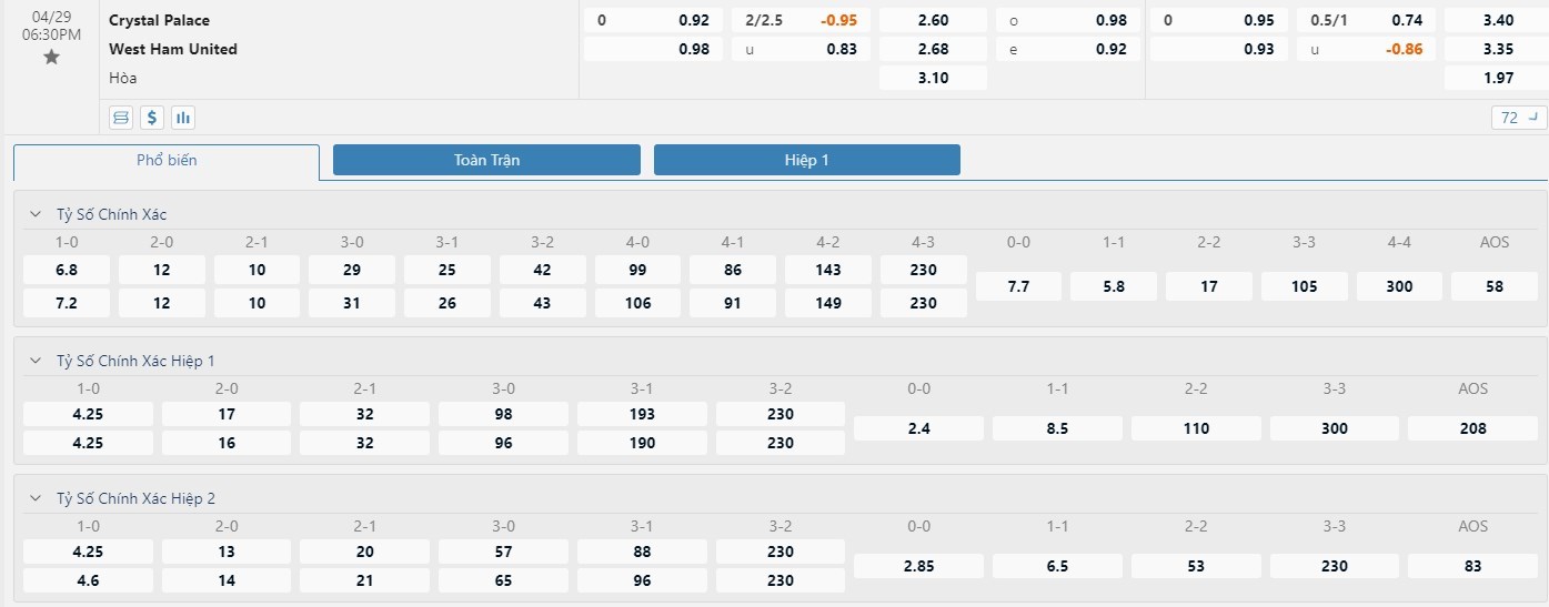 Đây là kèo đấu được đội ngũ chuyên môn nhận định là cặp trận cân tài cân sức. Nhìn trong 10 lần so tài gần nhất giữa hai đội thì càng thấy rõ được hai đội là những đối thủ ngang cơ. Cụ thể, mỗi bên có 3 chiến thắng, còn lại là 4 trận hòa. Có lợi thế chơi trên sân nhà nhưng Crystal Palace lại vừa mới nhận thất bại 0-2 dưới tay Wolves. Trận thua này chấm dứt chuỗi 4 trận bất bại trước đó của thầy trò Roy Hodgson. Trong khi đó, phong độ của West Ham đang được duy trì ổn định xuyên suốt từ đầu tháng 4 đến nay. Với chiến thắng tưng bừng 4-0 trước Bournemouth thì Búa tạ đã kéo dài mạch trận bất bại lên con số 5.