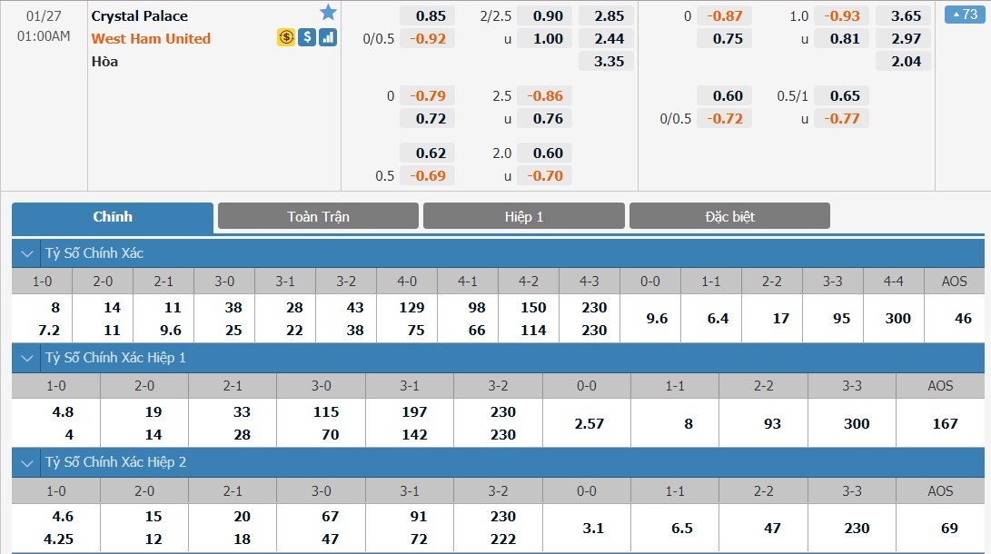 West Ham được đánh giá cao hơn đôi chút so với Crystal Palace ở kèo đấu này. Đội khách có tỷ lệ cược là 1 ăn 2.44 trong khi đội chủ nhà có tỷ lệ cược là 1 ăn 2.85. Tỷ số hòa có tỷ lệ cược là 1 ăn 3.35. West Ham đang có phong độ rất tốt. Chỉ phải làm khách trước một Crystal Palace không được đánh giá quá cao, West Ham được dự đoán sẽ có 3 điểm trọn vẹn ở trận này.