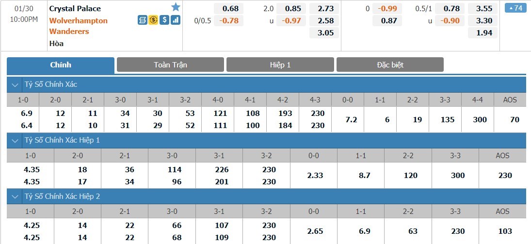 Wolverhampton chỉ được đánh giá cao hơn đôi chút so với Crystal Palace ở kèo đấu này. Đội khách có tỷ lệ cược là 1 ăn 2.58 trong khi đội chủ nhà có tỷ lệ cược là 1 ăn 2.73. Tỷ số hòa có tỷ lệ cược là 1 ăn 3.05. Phong độ của Crystal Palace đang là rất tệ và đây sẽ là một đối thủ vừa sức giành cho Wolverhampton. Với thực lực nhỉnh hơn đối thủ, Wolverhampton được dự đoán sẽ là đội giành trọn 3 điểm ở trận này.