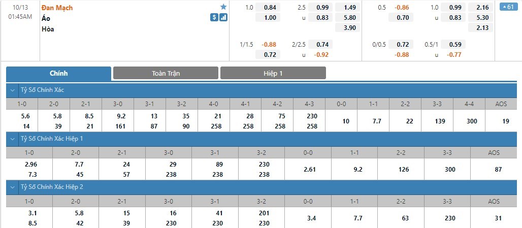 Đan Mạch sẽ được đánh giá cao hơn Áo rất nhiều ở trận này. Tỷ lệ cược của Đan Mạch chỉ là 1 ăn 1.49 trong khi đó Áo có tỷ lệ cược lên tới 1 ăn 5.80. Tỷ số hòa có tỷ lệ cược là 1 ăn 3.90. Đan Mạch vẫn đang tỏ ra cực kì ổn định trong khi đó Áo lại đang không có được phong độ cao. Ở kèo đấu này, cửa cược Đan Mạch sẽ là lựa chọn có thể tin tưởng.