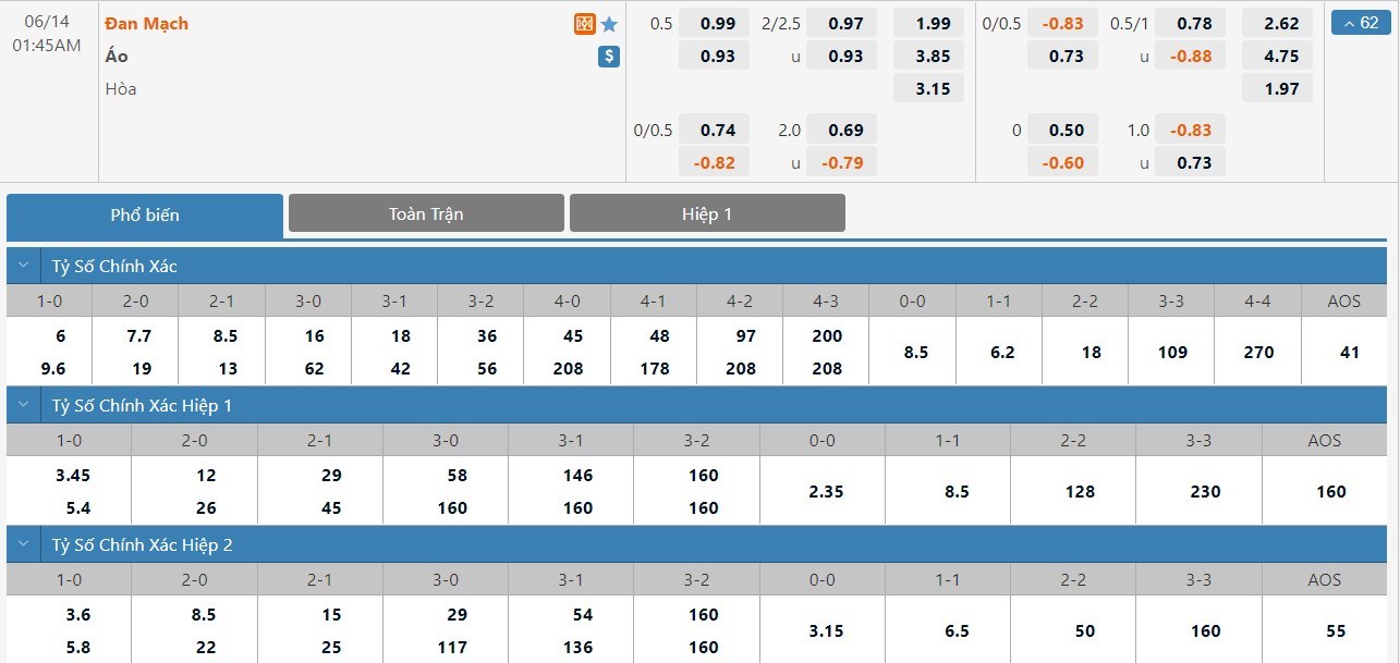 Dự đoán kèo tỷ số hiệp 1: Đan Mạch 1-0 Áo