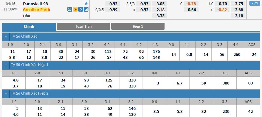 Kèo châu Á toàn trận: Darmstadt 98 +1/4 (FT)