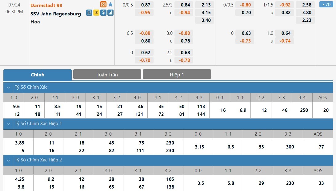 Dự đoán kèo tỷ số hiệp 1: Darmstadt 98 0-0 Jahn Regensburg