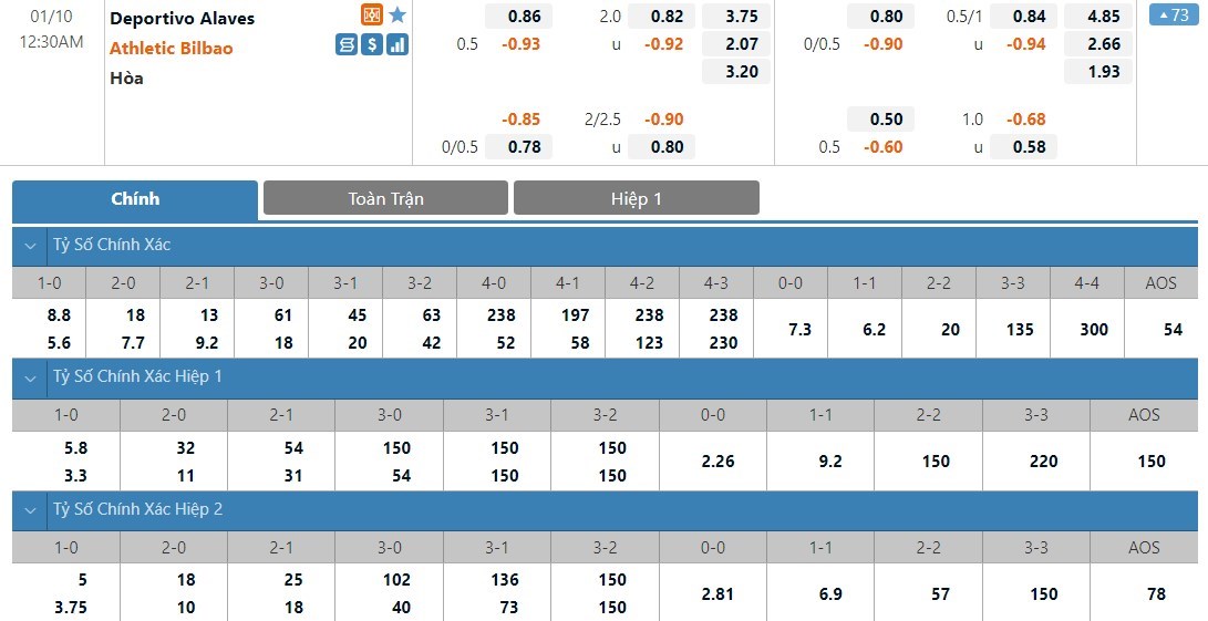 Dự đoán kèo tỷ số hiệp 1: Deportivo Alaves 0-1 Athletic Bilbao