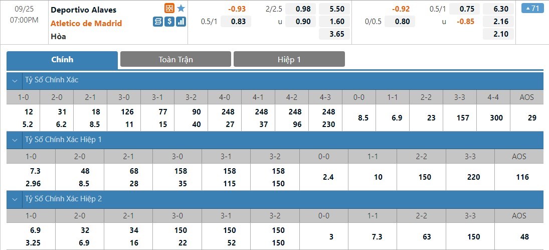 Dự đoán kèo tỷ số hiệp 1: Deportivo Alaves 0-1 Atletico Madrid