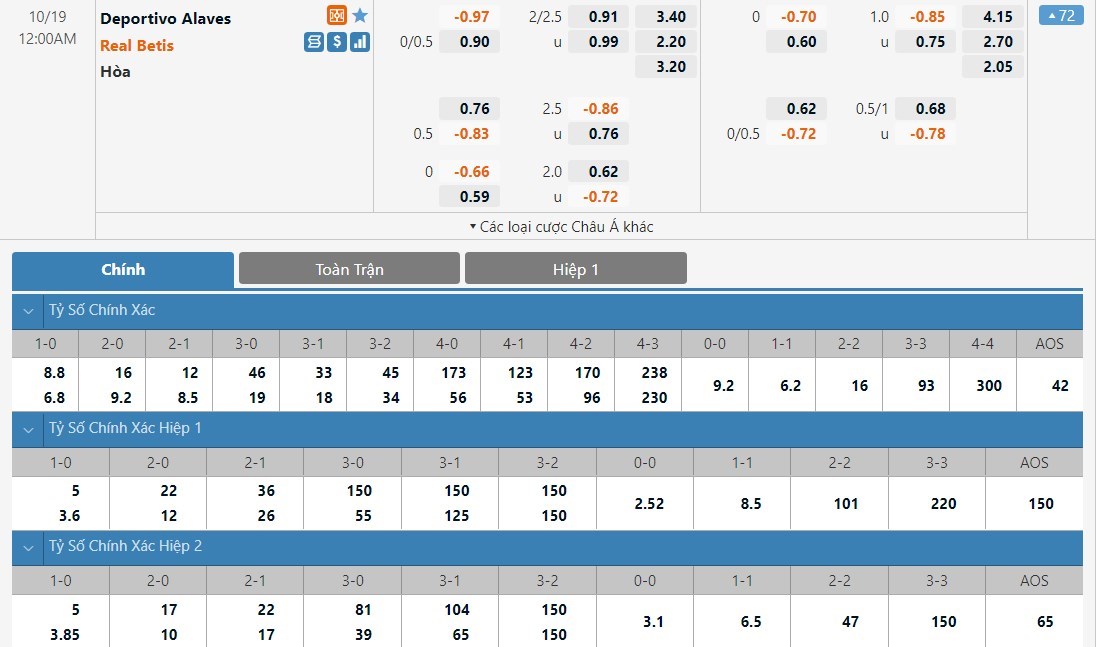 Real Betis vẫn sẽ được đánh giá cao hơn đôi chút so với Alaves ở kèo đấu này. Tỷ lệ cược của Real Betis chỉ là 1 ăn 2.20 trong khi đó Alaves có tỷ lệ cược là 1 ăn 3.40. Tỷ số hòa có tỷ lệ cược là 1 ăn 3.20. Alaves vẫn đang thi đấu rất tệ và họ vẫn đang bị đánh giá rất thấp. So với đối thủ, Real Betis đang tỏ ra nhỉnh hơn và họ sẽ đủ khả năng giành một chiến thắng ở trận này.