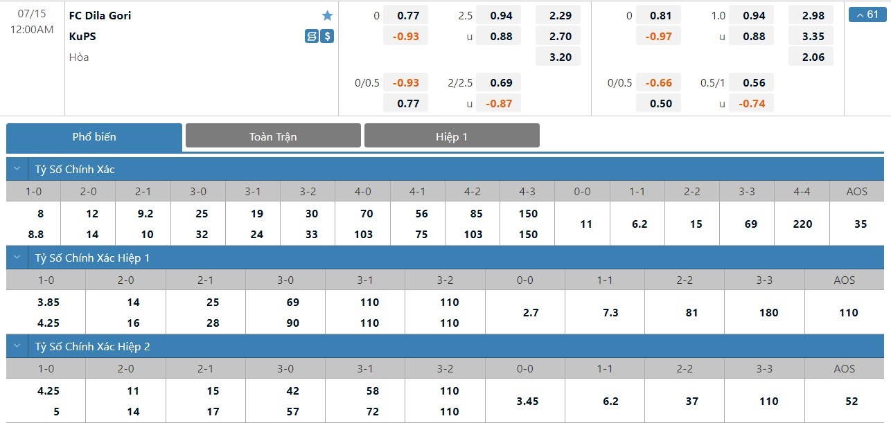 Dila Gori và KuPS sẽ có tỷ lệ cược khá cân bằng ở trận này. Kết quả Dila Gori thắng trận có tỷ lệ cược là 1 ăn 2.29 trong khi đó kết quả KuPS thắng trận có tỷ lệ cược là 1 ăn 2.70. Tỷ số hòa có tỷ lệ cược là 1 ăn 3.20. Dila Gori không phải cái tên có trình độ cao và họ ở những sân chơi châu lục bị đánh giá rất thấp. Đây là một đối thủ vừa sức với KuPS và đội bóng Phần Lan có thể vẫn sẽ kiếm được một kết quả hòa dù phải làm khách ở trận lượt về này.