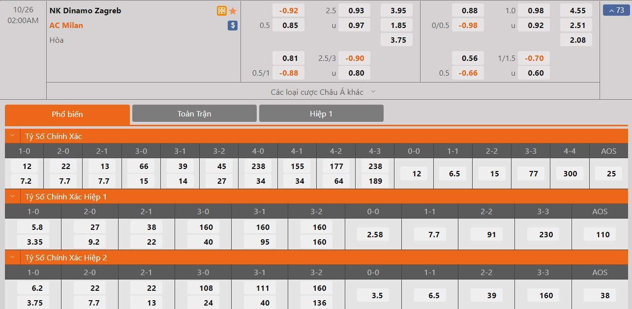 Dự đoán kèo tỷ số hiệp 1: Dinamo Zagreb 0-2 AC Milan