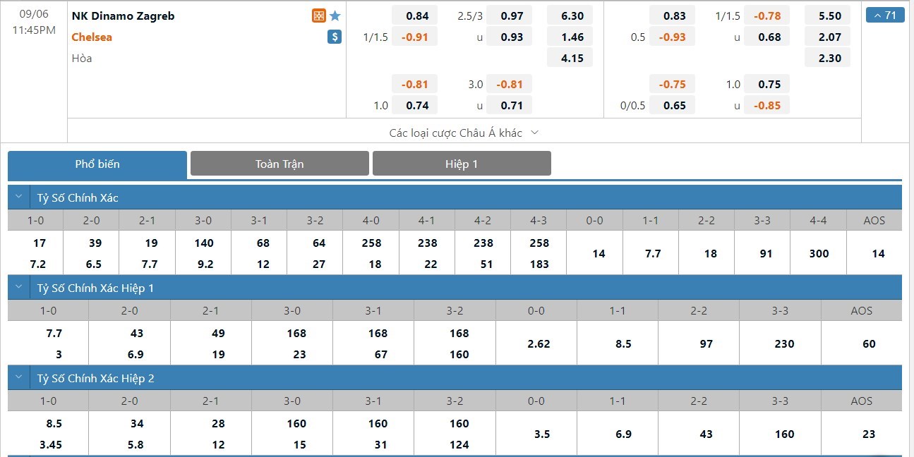 Dự đoán kèo tỷ số hiệp 1: Dinamo Zagreb 0-0 Chelsea