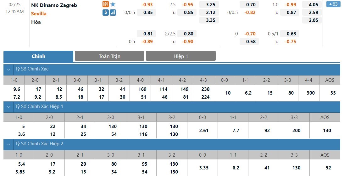 Dự đoán kèo tỷ số hiệp 1: Dinamo Zagreb 0-0 Sevilla