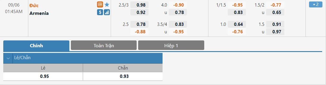 Kèo châu Á hiệp 1: Armenia +1 1/4 (HT)